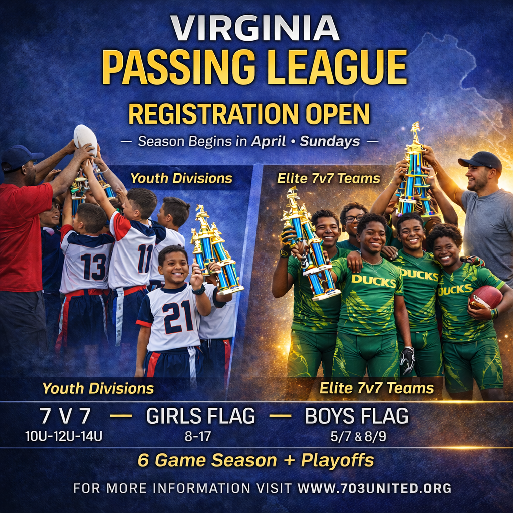 703 United Youth Sports is proud to welcome teams back for the Virginia Passing League Spring Season. We are now opening TEAM REGISTRATION for Flag Football and 7v7 teams, including teams from outside leagues and independent programs looking for competitive spring action.